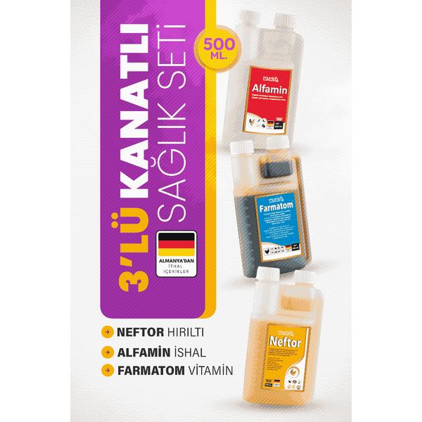 Bu set; Neftor (Hırıltı ve Balgam), Alfamin (İshal ve Kuruma), Farmatom (Vitamin ve Gelişim) ürünlerinden oluşur. Profesyonel kuş yetiştiricileri ve evcil hayvan sahipleri için tam kapsamlı bir bakım çözümüdür.