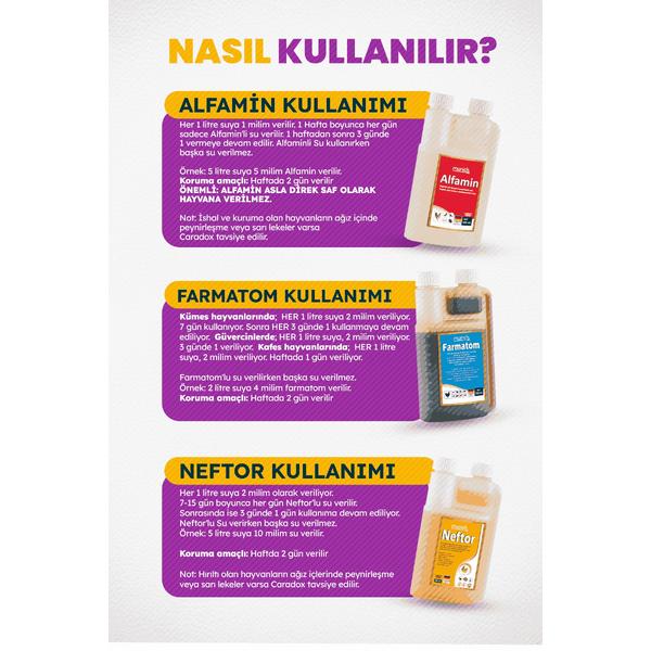Neftor Kullanımı; Her 1 litre suya 2 milim olarak veriliyor. 15 gün boyunca her gün Neftor'lu su verilir. Sonrasında ise 3 günde 1 gün kullanıma devam ediliyor. Neftor'lu Su verirken başka su verilmez.