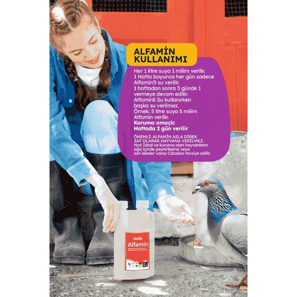 Her1 litre suya 1 milim verilir. 1 Hafta boyunca her gün sadece Alfamin'li su verilir. 1 haftadan sonra 3 günde 1 vermeye devam edilir.
