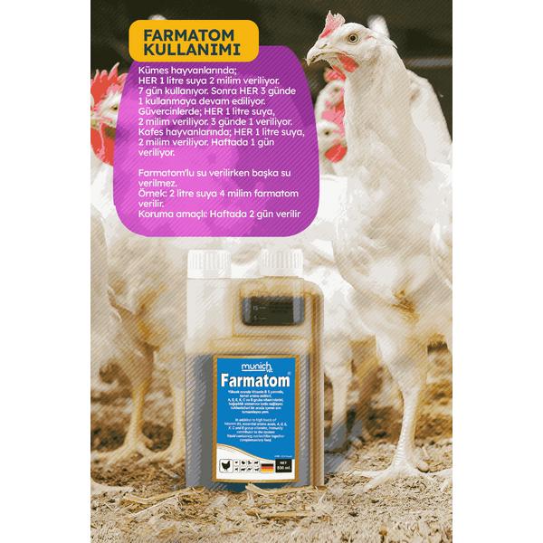 Munich Vet Farmatom, tüm kanatlı hayvanların (kuşlar, tavuklar, bıldırcınlar, güvercinler vb.) vitamin ihtiyacını karşılamak, gelişimlerini desteklemek ve bağışıklık sistemlerini güçlendirmek amacıyla formüle edilmiş sıvı vitamin takviyesidir. Özellikle stres, hastalık sonrası iyileşme ve yumurtlama dönemlerinde etkili destek sağlar.